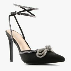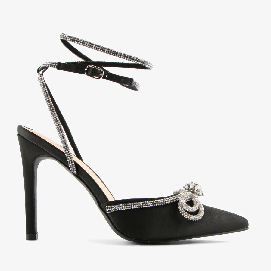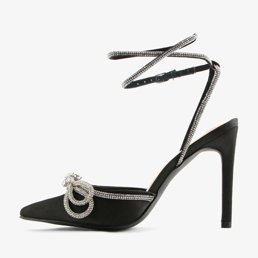 Elevate your formal look with Harley by Verali. Harley features a stiletto heel, a closed pointed toe with diamante details and a thin wrap around ankle strap with buckle closure.