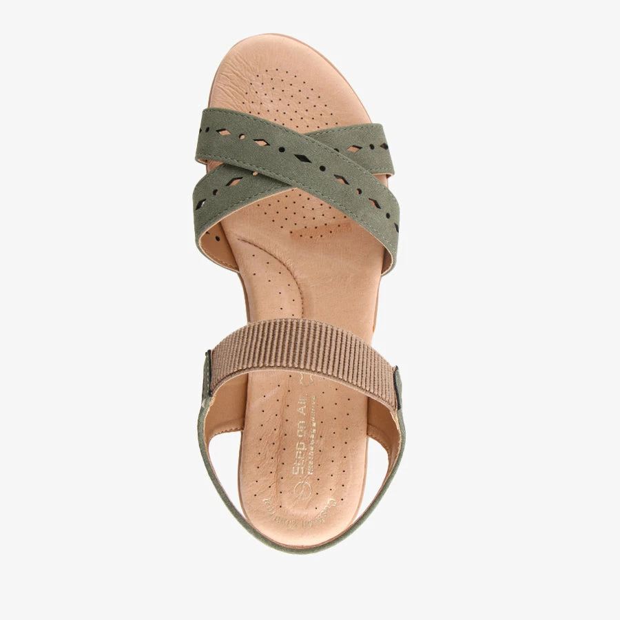 Juliet by Step On Air is a flat sandal that features a comfortable padded sole, cross over toe straps with perforated details and a wide elastic strap across the ankle for a comfortable fit.