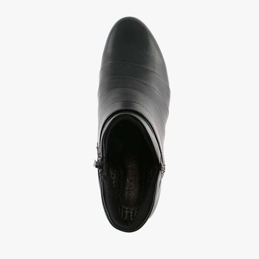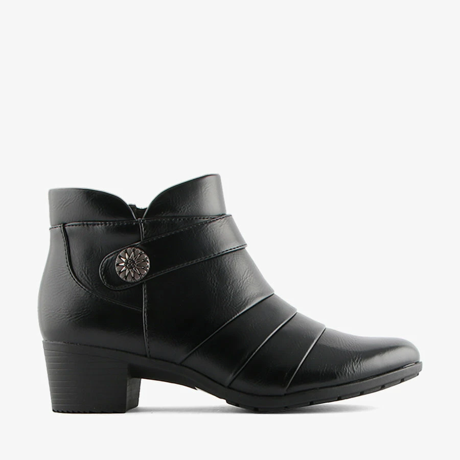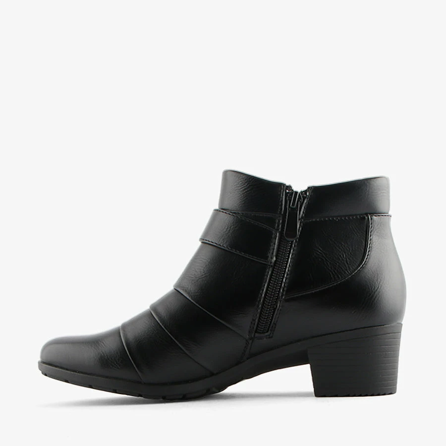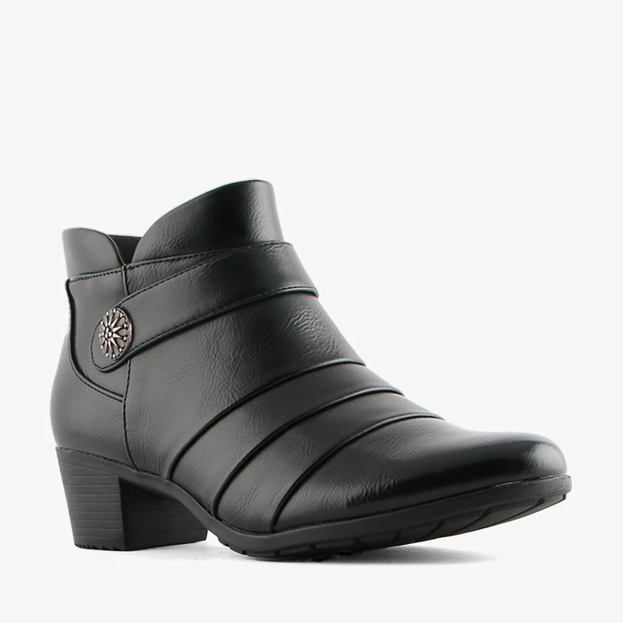 Kipper by Baretraps is a woman’s ankle boot that features a low stacked heel and side zip for easy wear. Kipper’s pleated fabric details and fake strap across the top make this the perfect style to dress up.