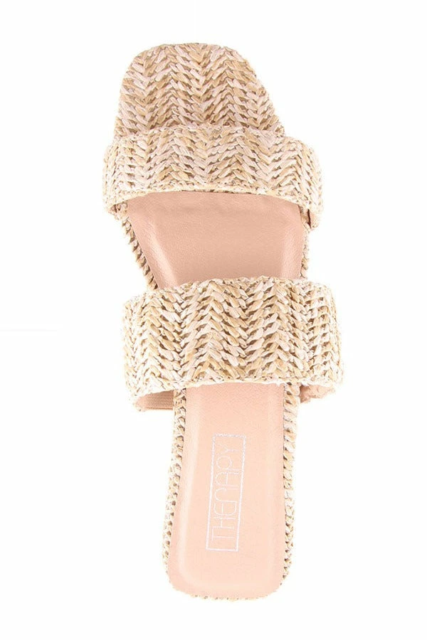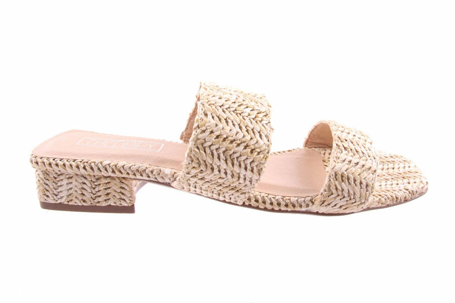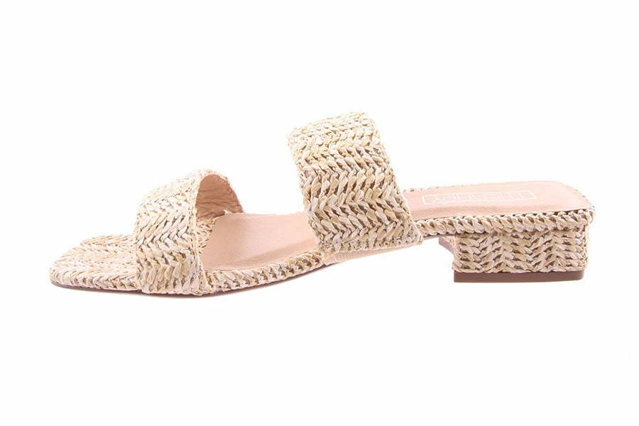 Lyla By Therapy is a women’s sandal that features a small block heel, two straps across the foot and a woven upper.