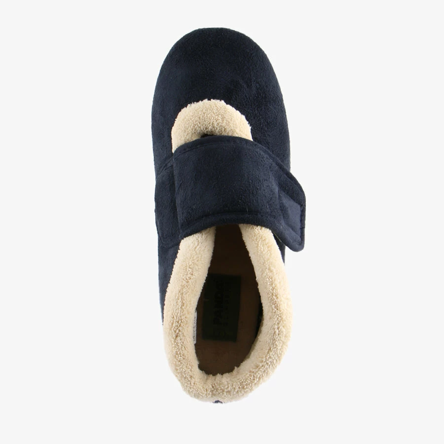 Emee by Panda is a women’s slipper with a velour upper, a velcro velour strap with an inner synthetic fleece lining, cushioned insole and a small heel. All Panda slipper feature a non-marking rubber outsole.