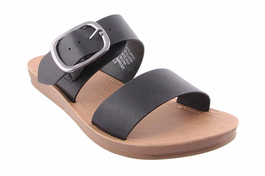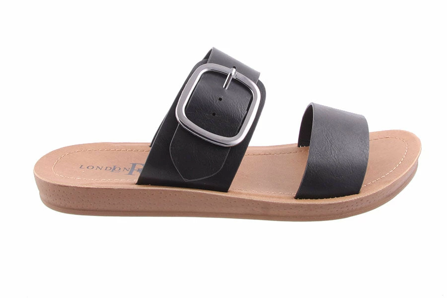 Slip into Rosario by London Rebel. This simple womens sandal features a two strap design and large buckle.