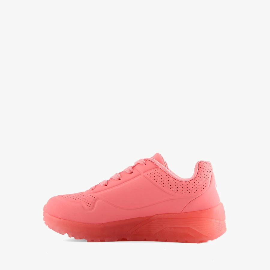 Uno Ice by Skechers is a kids sneaker that features a non marking sole, an air cooled memory foam insole and elastic bungee laces with velcro strap for easy wear. A machine washable design.