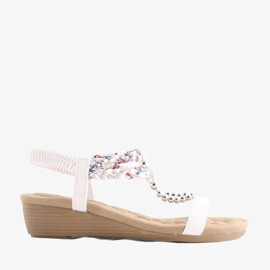 Tully by London Rebel is a low wedge sandal featuring a t-bar strap with embelished detail, elasticised back strap, and lightly padded insole. This sandal is perfect to dress up any casual look.