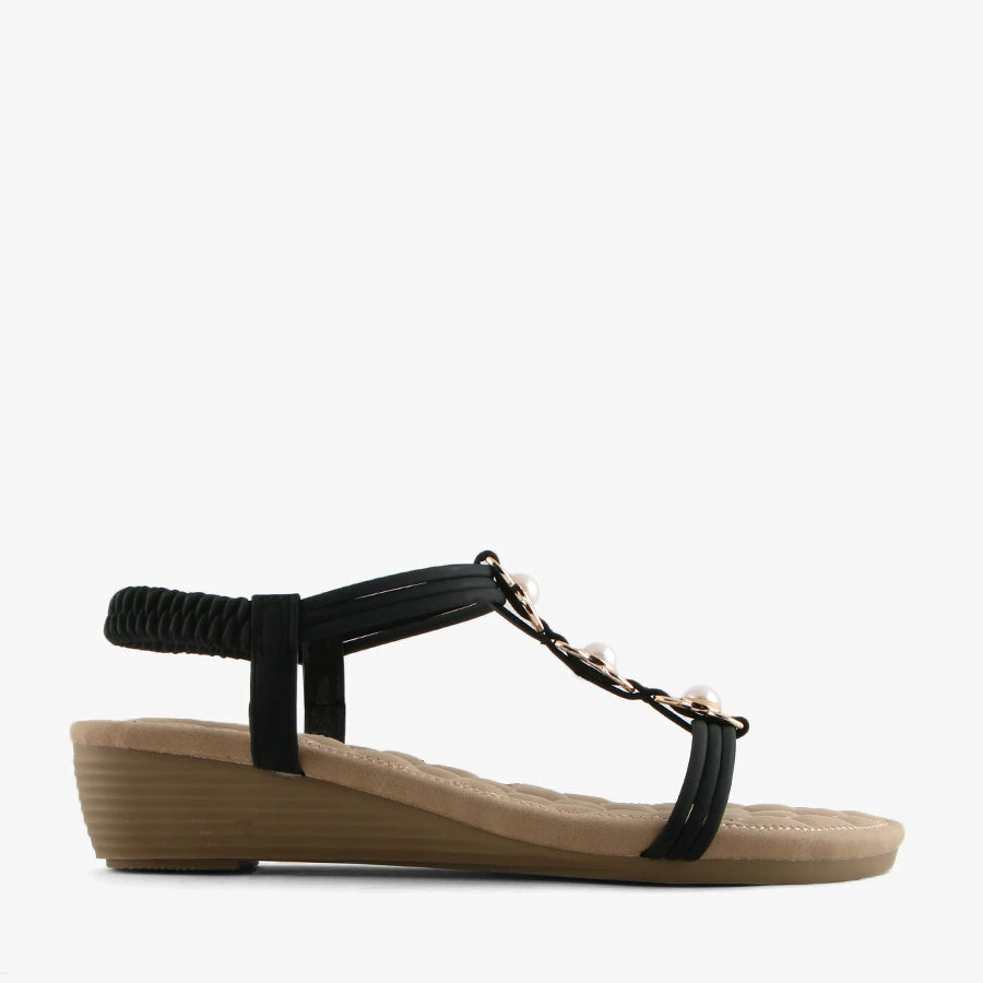 Look fashionable while feeling comfortable in Tulum by London Rebel Comfort. Featuring faux pearl trim on the T bar strap and a lightly padded insole with an elastic back. Ideal for casual wear in the warmer months.