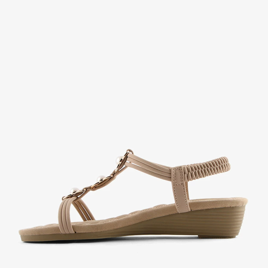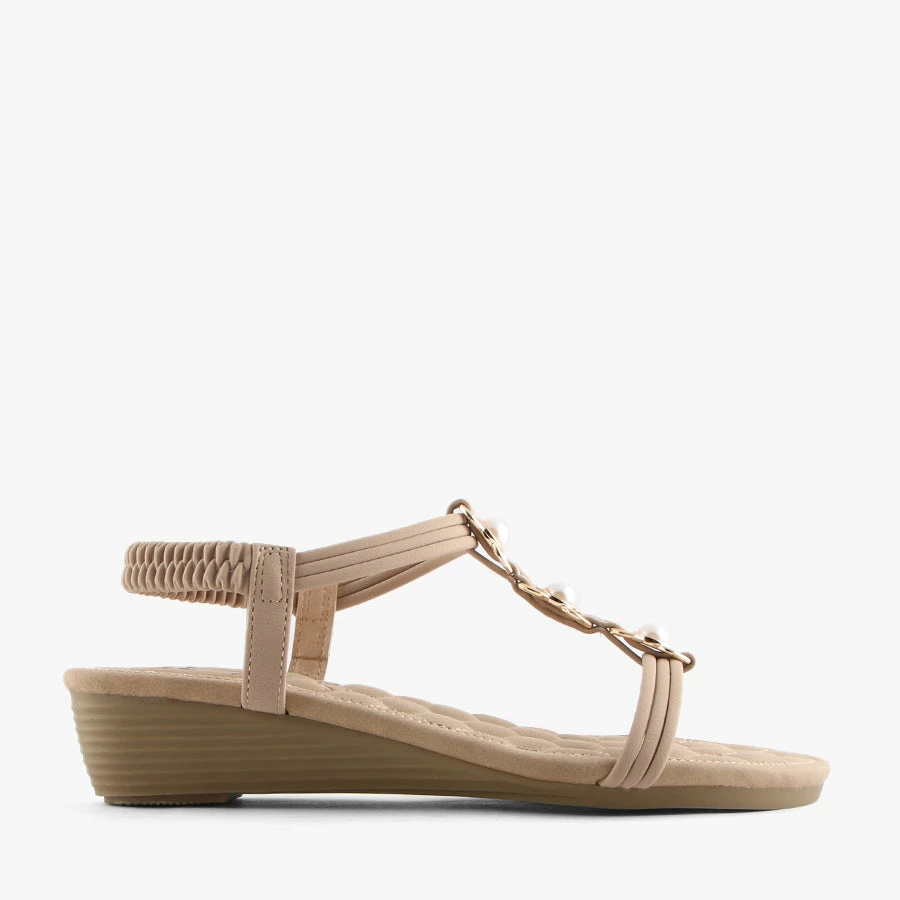 Look fashionable while feeling comfortable in Tulum by London Rebel Comfort. Featuring faux pearl trim on the T bar strap and a lightly padded insole with an elastic back. Ideal for casual wear in the warmer months.