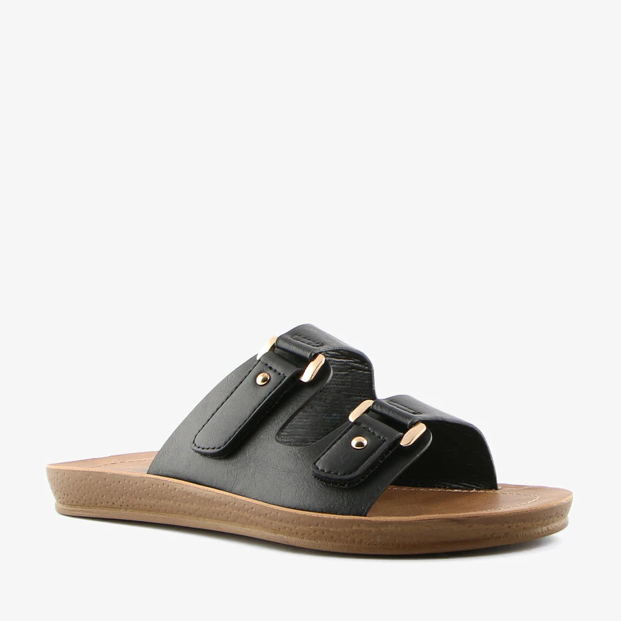 Zadie by London Rebel is a women’s slide sandal that features a flexible and lightweight sole with dual adjustable velcro straps.